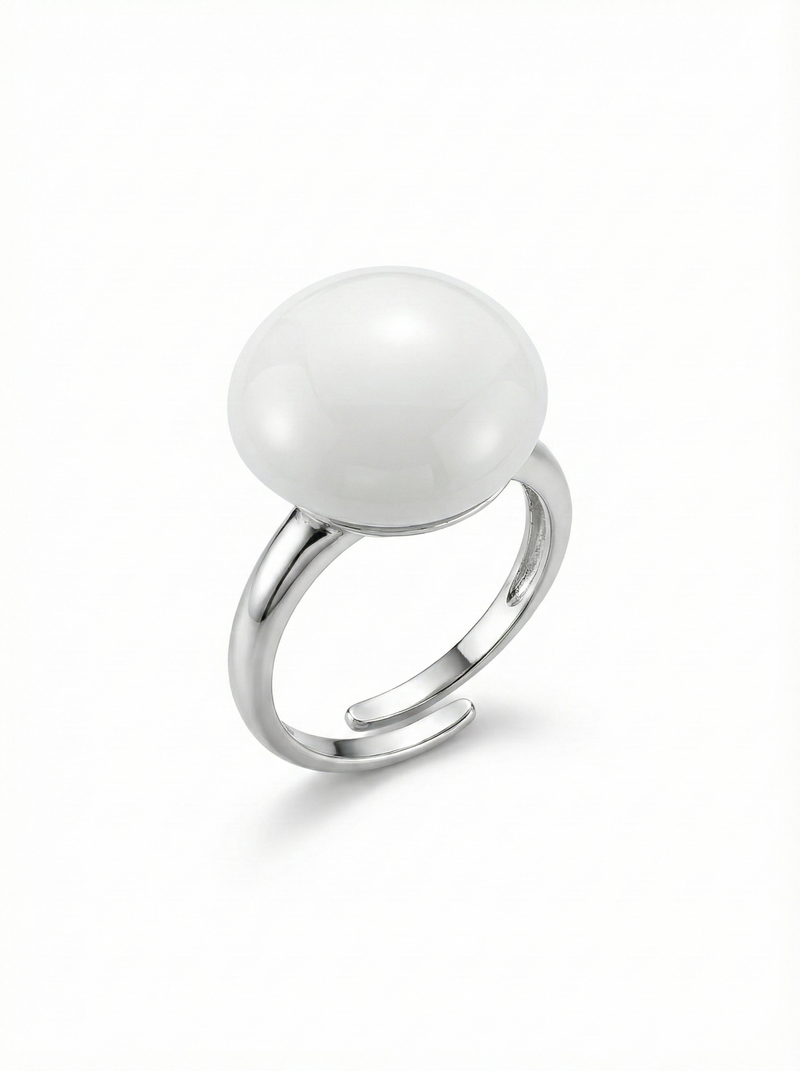 Questo anello in Argento925 rodiato abbraccia una agata bianca dalla superficie morbida e luminosa, come una piccola luna da indossare ogni giorno. La montatura aperta crea un effetto leggero e contemporaneo, lasciando che la pietra risplenda in tutta la sua purezza.