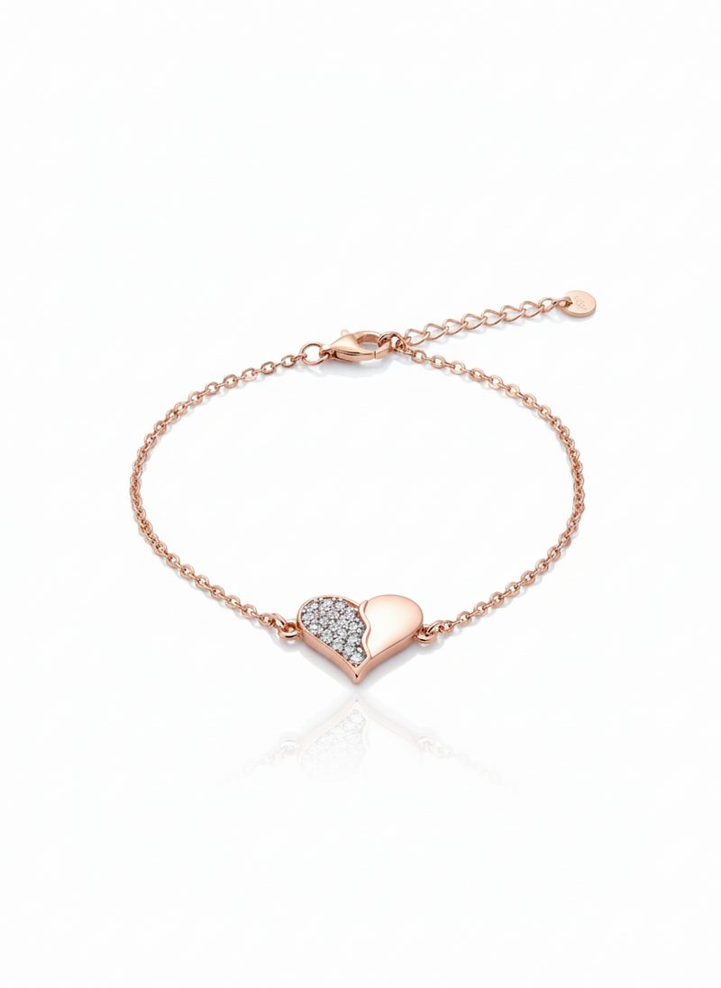 Un cuore che non sceglie, ma unisce. Questo bracciale gioca con i contrasti: una metà liscia, calda e avvolgente, l’altra illuminata da zirconi che catturano la luce a ogni movimento. La catena sottile in Argento925 placcato Oro Rosa completa il design con un tocco delicato e contemporaneo.