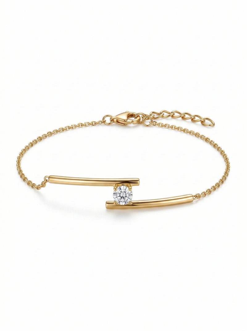 Linee pulite che si incontrano in un punto di pura luminosità. Il design aperto e minimale esalta lo zircone centrale, incastonato tra due profili dorati che creano un equilibrio moderno e raffinato.