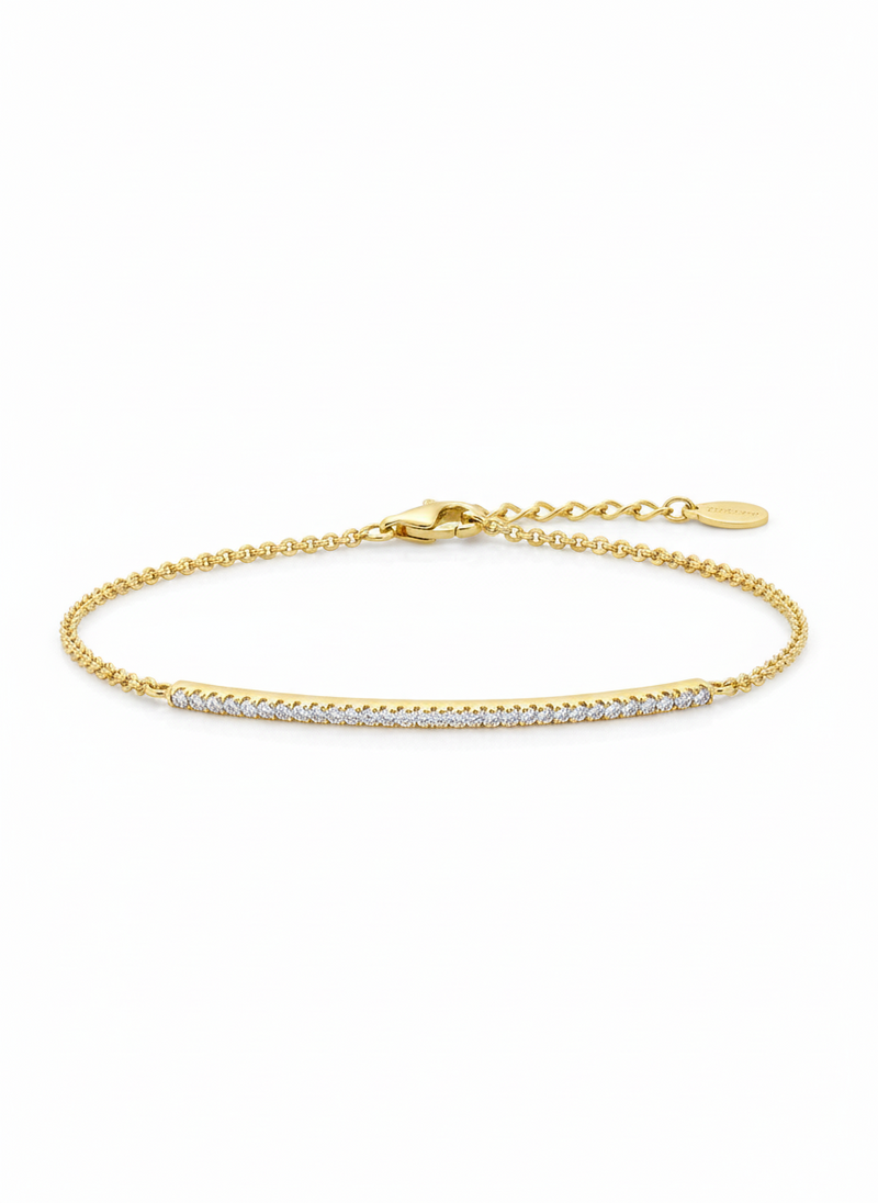 Essenziale, luminoso, preciso. Linea Chiara è il bracciale che punta tutto sull’equilibrio: una barra sottile di zirconi disposti con rigore, sospesa su una catena fine in Argento925 placcato Oro18k con zirconi incastonati.