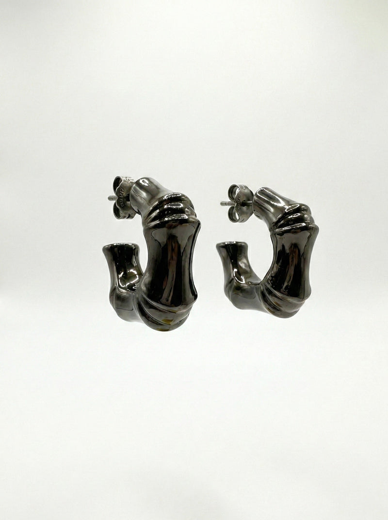 Le forme morbide e organiche, illuminate dalla finitura brunita, creano un carattere forte e contemporaneo, perfetto per chi cerca un gioiello che si faccia notare senza appesantire.