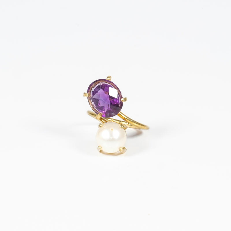 Anello contrarie con perla coltivata in acqua dolce e quarzo idrotermale.