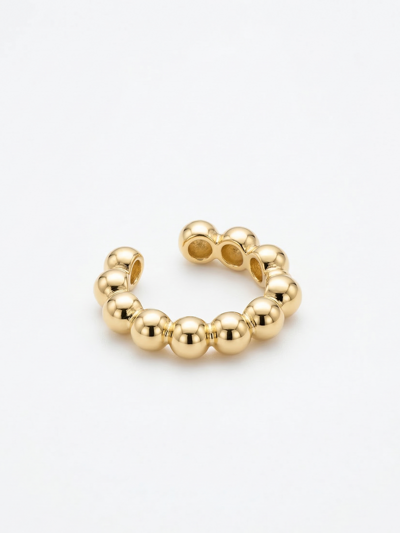 Questo earcuff in Argento925 placcato Oro18k è caratterizzato da una sequenza di piccole sfere dorate che creano un effetto morbido e contemporaneo. Il design arrotondato dona volume e luce all’orecchio, trasformando un dettaglio minimal in un vero elemento di stile.