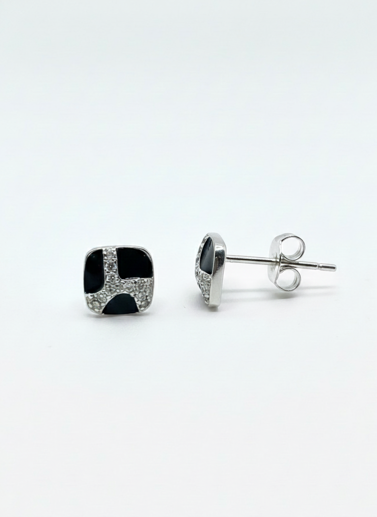 Monorecchino in Argento925 rodiato che gioca con geometrie pulite e contrasti decisi. Lo smalto incontra una scia luminosa di zirconi incastonati, creando un equilibrio perfetto tra minimal e carattere.