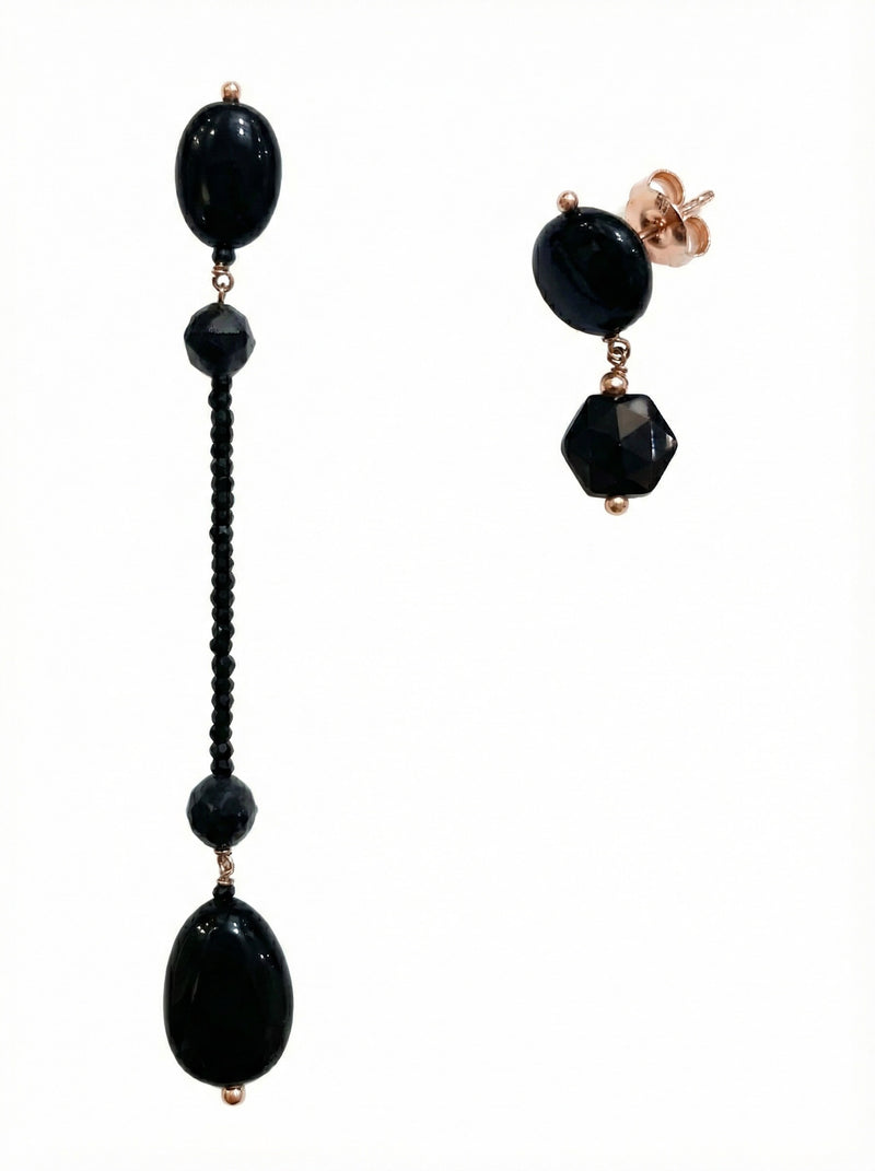 Questo orecchino in Argento925 placcato oro rosa unisce la profondità del legno laccato nero alla brillantezza sofisticata dello spinello sfaccettato, giocando con volumi e lunghezze diverse. Il contrasto tra il punto luce corto e il pendente lungo crea un effetto moderno e asimmetrico, pensato per chi ama distinguersi con stile.