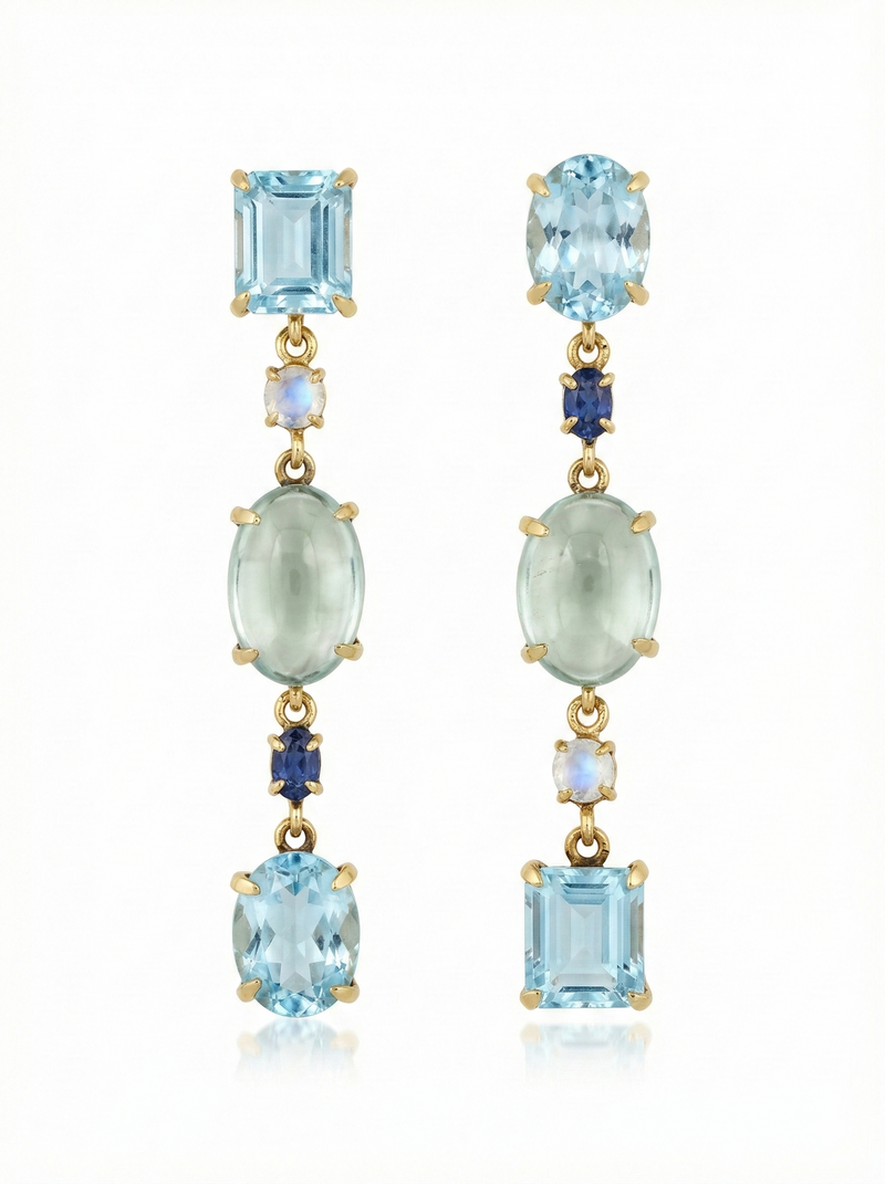 Questp orecchino è realizzato artigianalmente in Argento925 placcato Oro18k. Le tonalità dell’acqua si incontrano in una composizione sofisticata e magnetica: topazio blu, pietra di luna sfaccettata, iolite sfaccettata e un morbido cabochon di acquamarina milky al centro della scena.