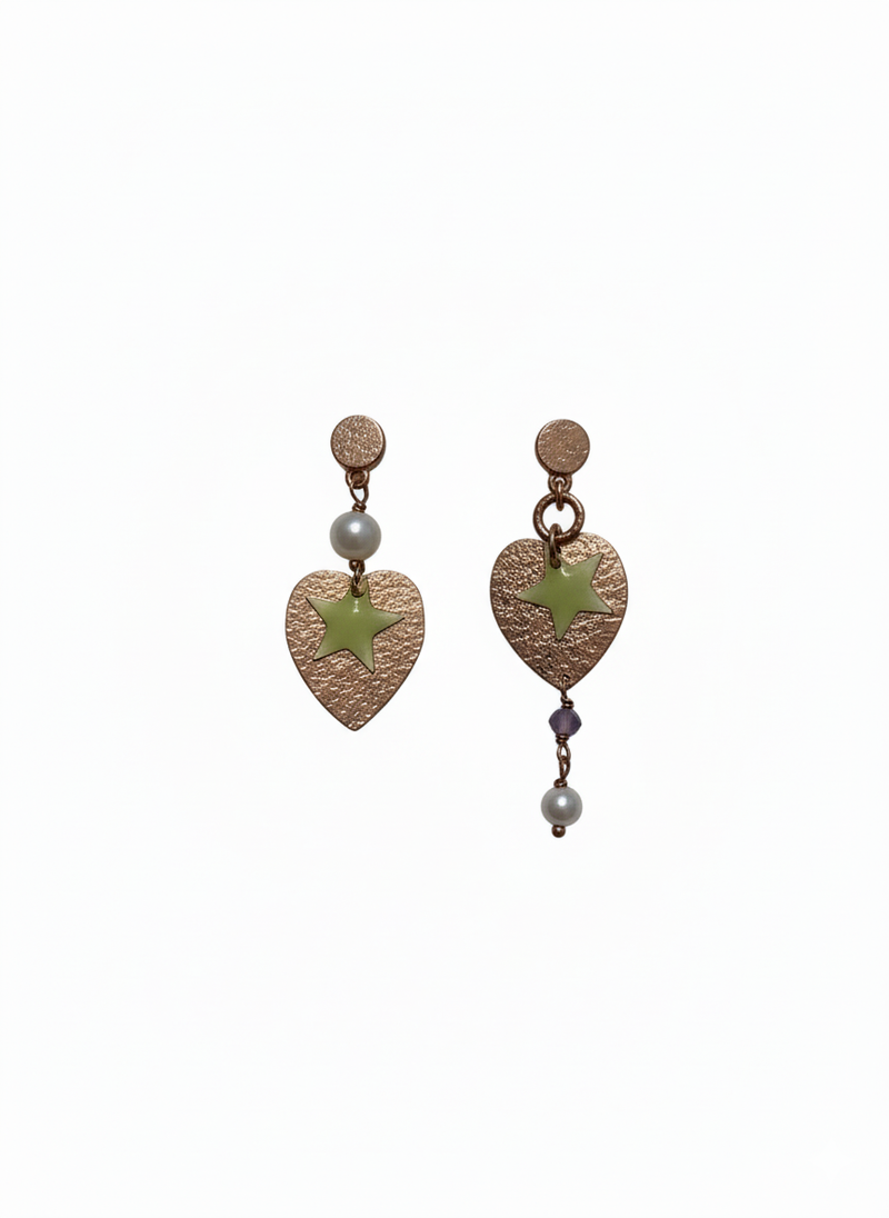 Orecchini realizzati interamente in Argento925 placcato Oro Rosa martellato impreziosito da due stelle smaltate color verde mela e due perle di fiume