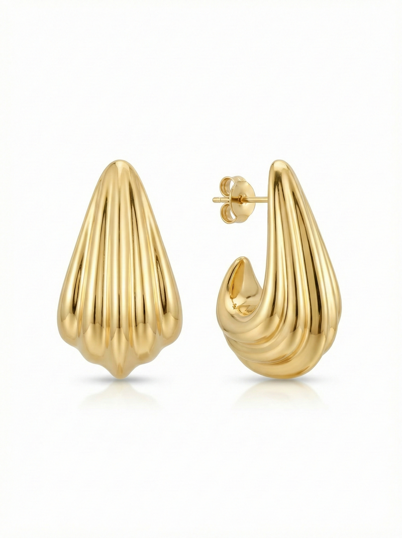 Orecchino scultoreo in Argento925 placcato Oro 18k, realizzato con tecnica di elettroformatura per un volume deciso e una sorprendente leggerezza. Le superfici lucide catturano la luce con naturalezza, disegnando una presenza elegante e contemporanea, pensata per valorizzare il gesto e il profilo.