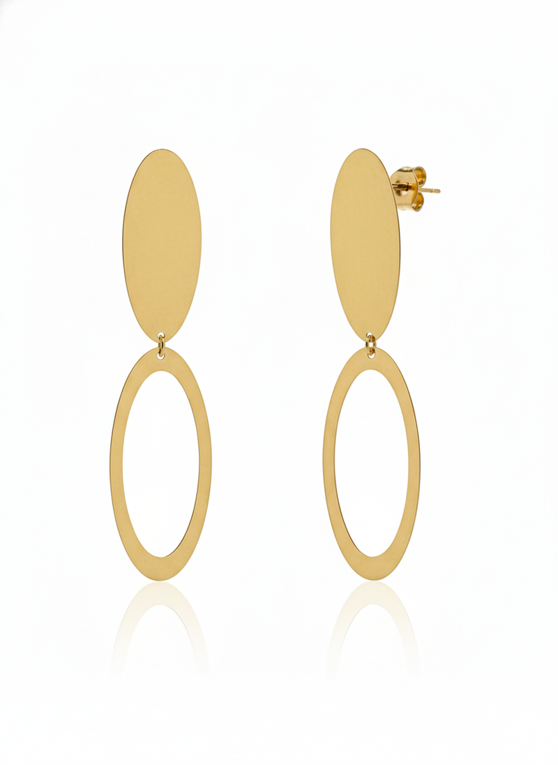Questo orecchino, realizzato interamente in Argento925 placcato oro 18k, unisce la purezza delle forme geometriche a un’eleganza minimalista e contemporanea. L’ovale pieno incontra l’ovale vuoto in un gioco di pieni e spazi che dona movimento e leggerezza, illuminando il volto con un riflesso caldo e sofisticato.